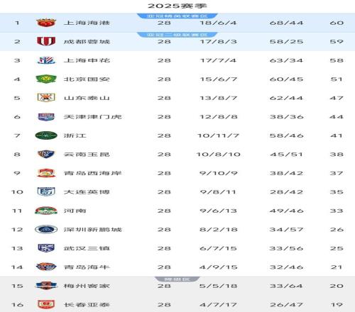 中超28轮积分榜:争冠3队仅差2分,海牛逃离降级区,降级或3选2