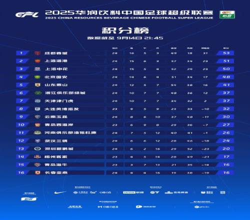 成都蓉城24轮后领跑,随后5轮1胜3平1负,提前1轮无缘争冠