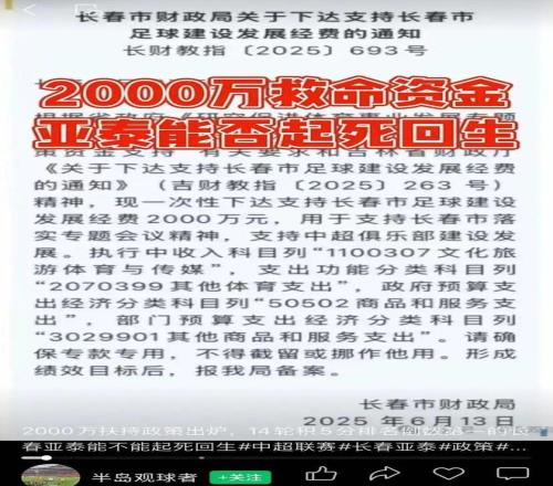 其实早于长春亚泰在十六支球队中排名垫底之时,吉林省政府主要领导调研中明确提出“助力长春亚泰足球俱乐部在中超联赛中保持合理位次”。 长春市专门下达2000万元财政资金,用于支持长春市足球建设发展,助力长春亚泰起死回生。