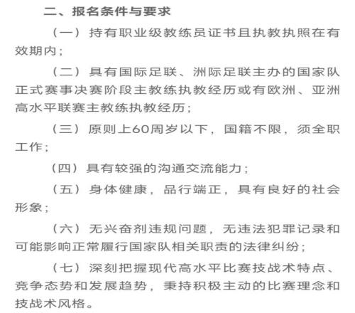 中国足协当初公布的国足新帅招聘条件,一共有7个:第一,持有职业级教练员证书且执教执照在有效期内;第二,具有国际足联、洲际足联主办的国家队正式赛事决赛阶段主教练执教经历或有欧洲、亚洲高水平联赛主教练执教经历; 第三,原则上60周岁以下,国籍不限,须全职工作;第四,具有较强的沟通交流能力;第五,身体健康,品行端正,具有良好的社会形象;第六,无兴奋剂违规问题,无违法犯罪记录和可能影响正常履行国家队相关职责的法律纠纷; 第七,深刻把握现代高水平比赛技战术特点、竞争态势和发展趋势,秉持积极主动的比赛理念和技战术风格。