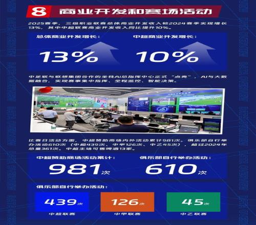 这些都意味着职业足球联赛有了更大的商业价值,尤其是作为龙头的中超,除了今年增幅接近1/3之外,各方普遍预测2026年会继续增加。2025赛季,三级职业联赛总体商业开发收入较2024赛季实现增长13%,其中中超商业开发收入同比提升10%。需要注意的是,中超的球市和收视率反映在商业价值层面有一定的滞后性,所以,我们也期待着2026赛季中超商业开发收入进一步提升。