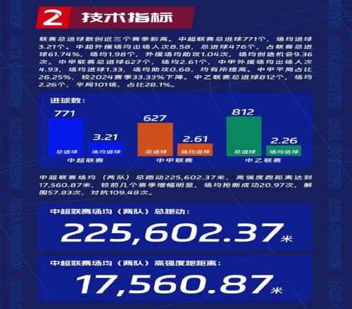 中超总进球771个,场均进球3.21个,这个数据也非常亮眼,这和中超战术打法普遍更加开放相关,这从联赛的实际观感中也可以看到,联赛的吸引力因此大幅度增加。 中甲总进球627个,场均2.61个;中乙总进球812个,场均2.26个,相比较而言,低级别职业联赛的进球略少,意味着总体战术偏于保守。 中超场均(两队)总跑动225602.37米,高强度跑距离达到17560.87米,较前几个赛季增幅明显,场均抢断成功20.97次,解围57.83次,对抗109.48次。