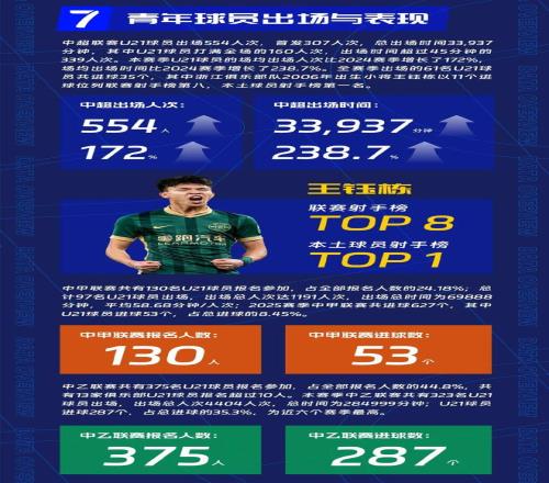 中超U21球员出场554人次,首发307人次,总出场时间33,937分钟,场均出场人次比2024赛季增长了172%,场均出场时间比2024赛季增长了238.7%,这是一个巨大的增长幅度。 全赛季出场的61名U21球员共进球35个,浙江队2006年出生的王钰栋以11个进球位列联赛射手榜第八位、本土球员射手榜第一位。 中甲97名U21球员出场,出场总时间为69888分钟,U21球员进球53个;中乙共323名U21球员出场,总出场时间为284999分钟,U21球员进球287个,占总进球的35.3%,为近六个赛季最高。 三级职业联赛U21球员合计进球达到了375个,中国青少年足球回暖在三级职业联赛得到了清晰体现,此外,各级青少年国字号的战绩也有起色:00、01和02三个年龄段三次无缘U17亚洲杯和U20亚洲杯,但从03年龄段起,各级国青和国少全面回归亚洲杯正赛且多次杀进八强,离回归U17世界杯和U20世界杯也越来越近。