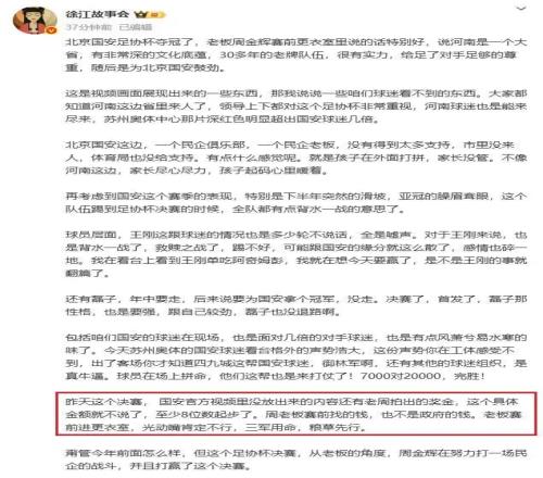 曝国安足协杯赢球奖高达千万,难怪河南输球,中足联规定成笑话 文/姜诗华 北京时间12月7日晚上,在足协杯决赛中,北京国安3比0战胜河南队夺得第5个足协杯冠军,与联赛后半程的疲软形成鲜明对比。让人惊讶的是,此次国安之所以三军用命夺得足协杯,正应了那句话:大军未到粮草先行。曝国安开出八位数足协杯赢球奖,难怪河南输球,中足联规定成笑话。 赛前,就有媒体披露河南队开出了500万赢球奖。不过,媒体人徐江在个人社交账号上发文谈及了国安这场足协杯决赛的奖金,其表示俱乐部老板周金辉拍出的奖金金额至少8位数起步,这是周老板赛前找的钱。如果徐江爆料属实的话,这意味着国安的足协杯赢球奖高达千万以上,远超河南队的500万,难怪足协杯决赛国安气势如虹,原来是重赏之下必有勇夫。