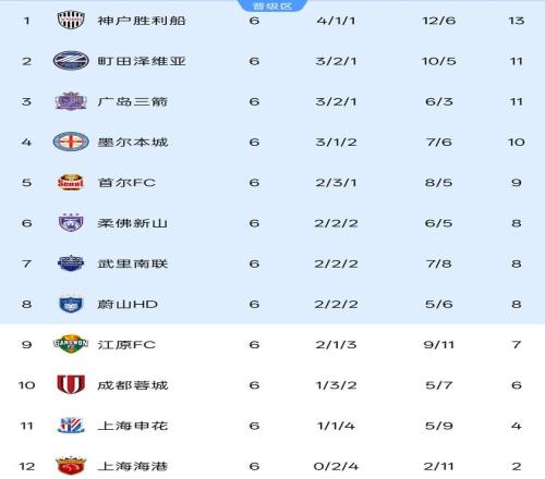 首个比赛日进行的4场比赛中,成都蓉城客场2-2战平榜首球队神户胜利船,上海海港客场0-0逼平柔佛新山,町田泽维亚主场3-1击败蔚山HD,武里南联主场2-2与江原FC握手言和。 6轮过后的积分榜,3支中超球队由于本轮仅取得2平1负的战绩,因此仍旧包揽积分榜倒数3名。其中成都蓉城积6分排在倒数第3,申花积4分排在倒数第2,上港则仅有2分排名垫底。