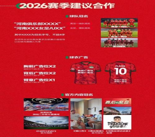 李英旋 优质体育领域创作者 1721篇原创 新赛季开始前,除了河南队球员变动的相关话题外。球迷群里也少见地开始讨论起球队的生存前景。 河南足球俱乐部最新发布的官方招商合作公告,2026赛季建议合作中,球衣冠名和球衣广告(胸前广告位x2 背后广告位x1)位列前两位,官宣了河南队仍在投资困境中艰难跋涉,让这支上赛季足协杯亚军球队的前景蒙上阴影。