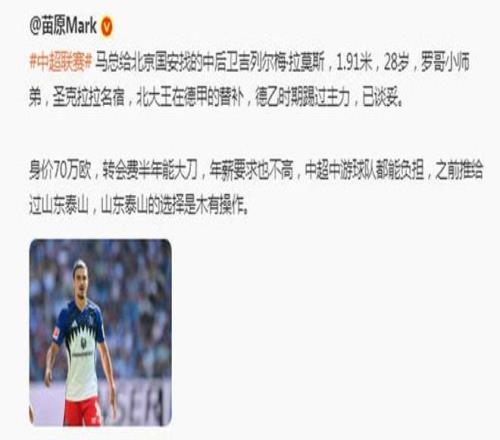 吉列尔梅-拉莫斯现年28岁,正处正打之年,身高1米91,德乙时期踢过主力,希望能防住韦斯利、费利佩等外援。另据媒体人苗原透露,国安谈妥的这名汉堡中卫,年薪不高,还曾被推给山东泰山。对此,有泰山球迷表示:“我们有彭啸了,不要这个了”。其实,也要一名高性价比中卫。